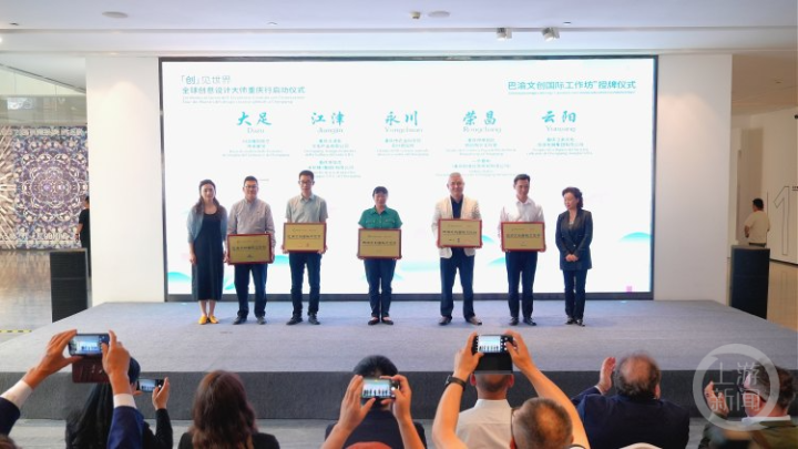 活动现场,6位国际设计大师分别与大足区、江津区、永川区、荣昌区、云阳县五个区县的非遗传承人,以及四川美术学院、重庆文创机构“结对”,并互赠“文化信物”。大足区、江津区、永川区、荣昌区、云阳县五个区县被授予“巴渝文创国际工作坊”文化标识。